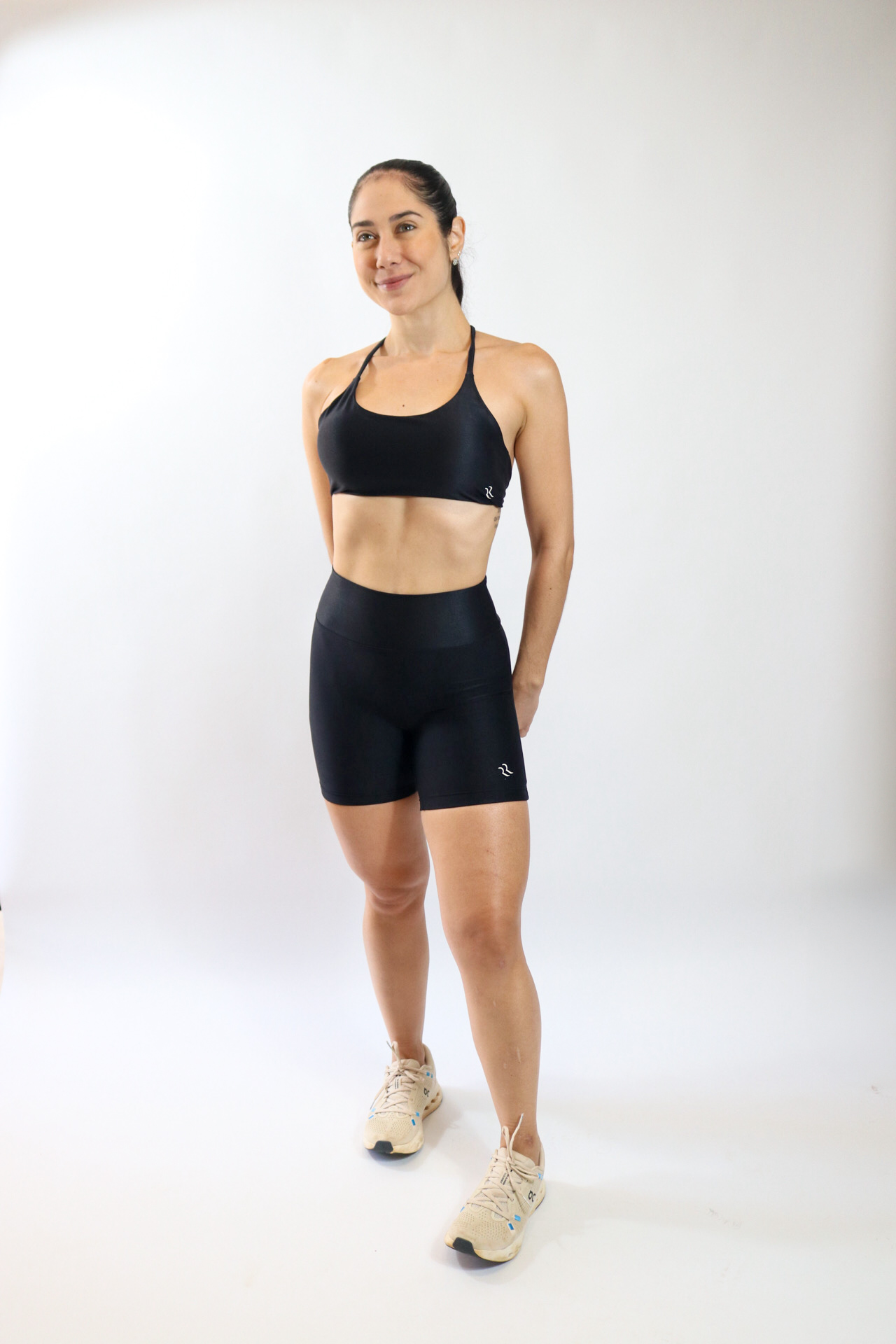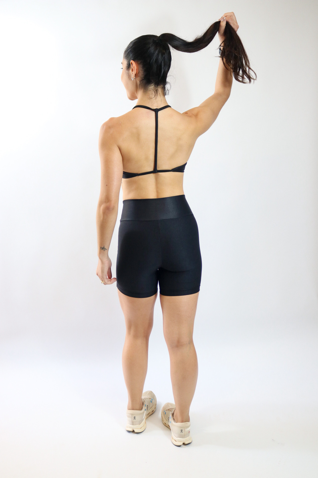 Modelagem clássica e 100% lisa, shorts no tecido canelado com brilho, cós alto e largo que oferecem maior conforto, segurança e garantem a modelagem da silhueta.
